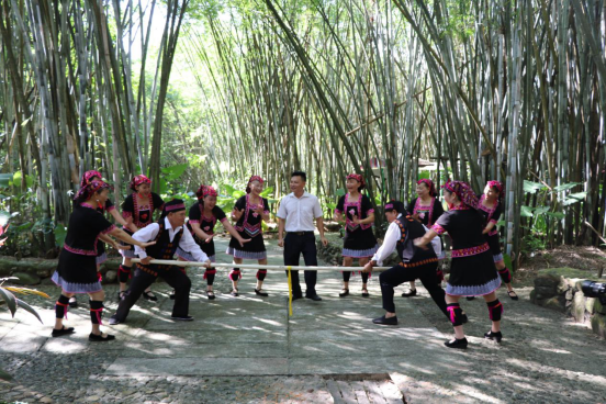 采访结束后,在村民委员会主任的介绍下,调研团来到村子里的黎苗文化大舞台充满苗族文化气息的舞台和身着苗族文化服饰的苗族都让调研团成员领略到了苗族特色文化的魅力。最美苗族传统舞蹈——竹竿舞也在黎苗文化大舞台上展现着独属于少数民族舞蹈的美,竹竿舞的配乐和优美典雅的动作带着浓厚质朴的民族气息。最后,调研团在一场苗族献给共产党的舞中结束了一天的调研任务,舞蹈中苗族人民对共产党淳朴真挚的感情深深地打动了调研团全体成员