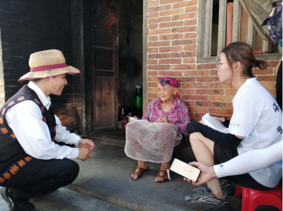 调研团随后一位年龄高达93岁的苗族阿婆进行采访。据村民委员会主任介绍,阿婆的孙子现在是在伍军人,而她自己也是黎苗两族共同抗战时期的一批年轻人。调研团同阿婆和村民委员会主任的交涉过程中进一步发掘了部分藏在老一代记忆深处的关于抗战年年间的故事。加脑苗寨的地理位置十分特殊,它被三座大山围靠且傍邻万泉河,形成了一处天然的隐蔽堡垒,而琼崖革命时期海南省的形势十分严峻,加脑苗寨凭借其优越的地理环境,保护了战时受伤的革命军人。当时革命军决定在这里建立后勤医院,主要用于救治和收留伤员,在反革命势力的围剿中,革命军给予的信任与保卫中国的奉献精神让加脑苗寨村民不惜牺牲自己的生命也要去保护后勤医院,即使到了何种地步也绝不透露后勤医院地址一丝一毫的消息。不屈不挠的精神加之共产党的领导,革命战争最终胜利,而加脑苗寨的苗族村民们也为会山镇最后的革命胜利作出了不可磨灭的贡献。在老人的家中,可以看到象征着优秀共产党员——“光荣军人”的称号及悬挂在大门旁令人心生敬畏的“光荣之家”牌匾。通过苗族阿婆与村民委员会主任的叙述,这些极其具有纪念意义的标志顿时生动鲜活了起来,历史的场景似乎从眼前闪过,调研团对加脑苗寨苗族村民对过去革命胜利如今苗寨安定生活所作出的贡献有了更深入的理解。