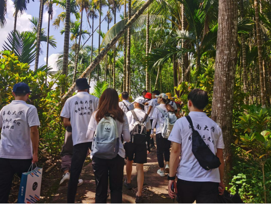 下午13点30分,调研团出发前往第二站——会山镇加脑苗寨。抵达目的地后调研团在村民委员会主任引导下进入苗寨。走访调研途中,调研团成员在村民委员会主任的介绍以及讲解下学习了解到部分苗族传统习俗。三月三青年男女对歌恋爱,由于加脑苗寨邻靠万泉河,三月三的传统习俗在这里与万泉河有了紧密的联系,青年男女以生生不息的万泉河为见证者来互表爱意;苗族人民崇尚自然,敬畏自然,他们深信万物有灵,在加脑苗寨也有着一颗树,承载着他们村里苗族人的信仰,那是村庄里年龄最大的一棵树,这颗年岁颇高的树被村中人敬称为“树神”,每逢过节,村里的苗族人会在树上系上红绸带来祈愿;走访途中,调研团还发现村里颇具特色的建筑墙体上有一幕幕苗族传统文化节日的场景,颇具生活气息的绘画将整个村庄装点成了一道靓丽的风景线。