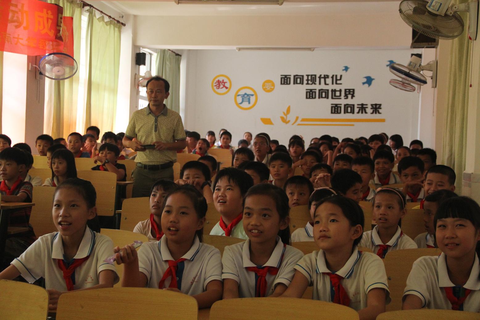 下午两点三十分,团队成员准时到达云龙中心小学,在该校韦副校长的帮助下,参加活动的100多位同学有序地进入会场就坐后,活动顺利开始。活动开始前,团队成员为同学们播放了前期制作的视频《全国大学生纪念抗战胜利70周年寻访活动》,视频具体围绕抗战胜利七十周年展开,逐步将主题引入抗战时期的海南战场,进而引出本次宣讲活动的主题——“铭记历史、圆梦中华”,视频结束后,团队代表团队代表朱凯峰、起家林等六名同学分别就本次暑期社会实践活动中印象最深的一位抗战老兵的故事与同学们一起交流,团队成员以生动的言语,将张云逸大将、远征军云昌舜等人的抗战光荣事迹讲给同学们听,使同学们对抗战有了更加深刻的记忆与体会。