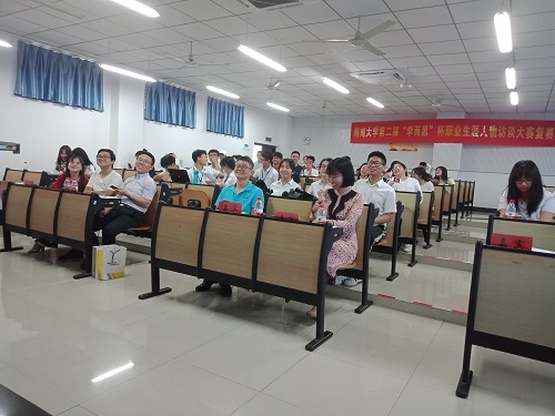 为帮助同学们走近成功人士,了解职业发展路径,更好的规划自己的大学生活,5月11日下午,英国上市公司365和外国语学院联合举办的海南大学第二届“学而思”杯职业生涯人物访谈大赛复赛在5-203顺利举行,共有十五支队伍向我们展示了他们更加精彩的作品。担任比赛的评委有:英国上市公司365学工办主任崔建兵老师,外国语学院李娜博士,江森自控海南分公司销售工程师门宝峰(2012级校友),2015级邓镓敏学长和于萍萍学姐。比赛由学生职业发展中心高迅铭和李晓雨主持。