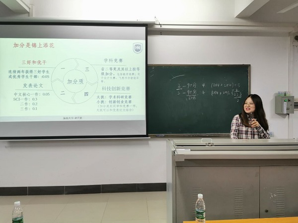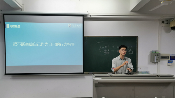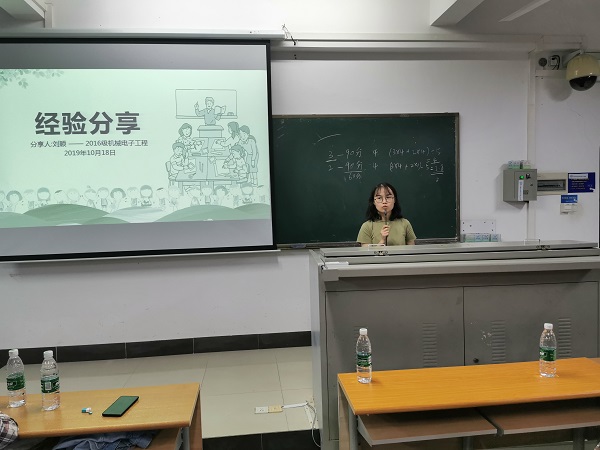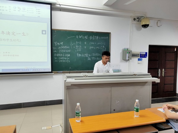 张懿唐学长以“做出属于自己的选择、砥砺前行度过一个精彩充实的大学生涯”为主题,他从绩点、素拓分、发展分以及加分竞赛等情况做了具体的介绍,并告诫学弟学妹们奋斗的青春最美丽;赵艺雯学姐以“你的负担将变成礼物、你受的苦将照亮你的路”为主题,介绍了推免的要求,并以自己从高绩点到满绩点的学习经历激励同学们努力学习,同时建议同学们要找准目标、制定计划、努力、自律、不断前行;罗怡坤学长以“把不断突破自己作为自己的行为指导”主题,他从时间管理和大二如何选择专业两方面,以及结合自己参加科研的经历为同学们给出了建议;刘颖学姐结合自己的经历,就如何学好专业课和平衡学生工作作出了一系列的回答;王开兴学长以“你的能量超乎你想象”主题,用“鼓掌”的方式告诉了同学们你的能力超乎你想象,并就如何度过自己的大学生活做了分享,建议同学们多参加课外活动,丰富自己的业余生活。