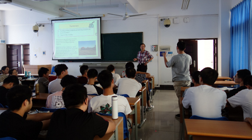 陈光南教授先后为本科生和研究生进行讲学,主要结合澳大利亚当地的气温气候,介绍了当地的农作物特点和农业机械的发展状况,并结合海南与澳大利亚昆士兰的地域特色和地理位置,以一些典型的农业机械为例展开深入教学,例如播种机械、施肥和除草机械以及收获机械等。整个课程采用西式教学的方式,鼓励同学们积极提问,自己也认真回答同学们的问题,课堂气氛活跃。课余期间,陈光南教授也积极地回答同学们关于留学、学术研究等方面的问题。经过本次授课,学生们了解了许多国外农业机械化的发展现状,以及先进农机装备和前沿技术,开阔了眼界,提升了学习与科研热情。