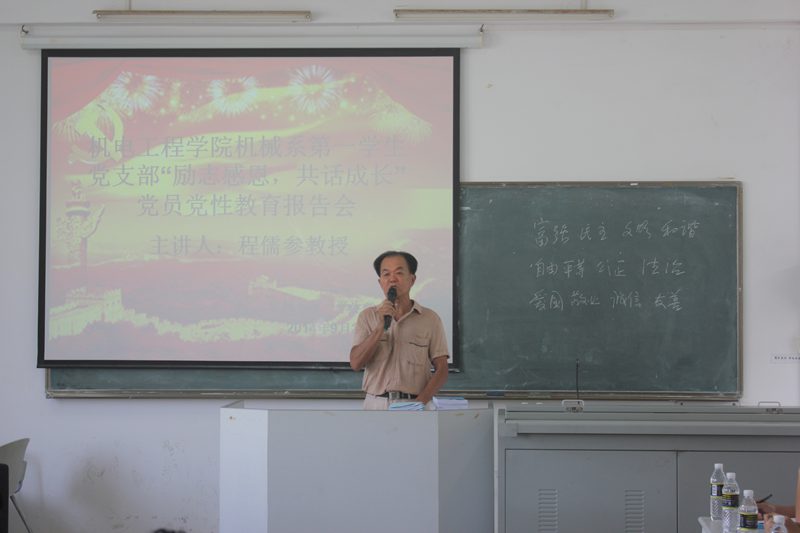 此次报告共分为两部分。第一部分是由程教授为党员同志做“励志感恩,共话成长”的主题报告。程教授声音洪亮,精神饱满,向我们介绍了党的十八大提出的社会主义核心价值观,详细阐述“富强、民主、文明、和谐,自由、平等、公正、法治,爱国、敬业、诚信、友善”。程教授逐字逐句阐述了自己的见解与感悟,从历史角度举出大量事例,如匡衡,钱学森,霍金等等还讲述自己的故事,并分享了自己的故事,讲述了自己童年生活的艰辛,少年求学路上的勤奋好学,仕途中勤勉为民、利益社会的事迹,还有绵绵的乡情,儿女情长的孝子心等等。他鼓励大家要搞好学习,提升能力,予宜多,取宜少,仇要忘,恩要报,感恩父母,老师,朋友,社会。同学们听得非常认真并仔细做了笔记。他的精彩演讲,赢得观众的热烈掌声。第二部分是交流互动环节,在场党员同志纷纷向三位教授请教学习工作生活中的困惑,三位教授对学生的困惑一一做详细的解答。在解答过程中,教授们给予我们在场的青年同志宝贵的建议,如在读书或做事业的过程中,还要学会讲究方法。最好的办法就是做到“四勤”。即勤动脑、勤动嘴、勤动腿、勤动笔。解读开来就是,勤动脑想问题;勤动嘴不耻下问;勤动腿深入实际调查研究;勤动笔作记录、笔记和写文章。他们精彩独到的解答再次博得热烈的掌声。11:30分左右报告会在大家的热烈掌声中圆满结束。程教授、王教授向在场的同学赠送20余本由老人亲笔撰写,并自掏腰包编制、印刷的书籍,其名为《恳谈集——人生感悟》和书海拾贝传承中华传统文化。最后崔建兵老师对会议做出总结,次感谢三位老教授能够在白忙之中抽出宝贵时间为我们做这次报告,希望在场的所有党员同志在学习、工作、生活中起到引领示范的作用,加强党性修养,树立明确的奋斗目标,勤奋努力读书,怀揣着一颗感恩的新,为践行社会主义核心价值观贡献自己的力量。