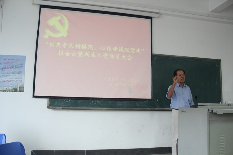 为加强新生对我党认知,端正其入党动机,鼓励在全面提高学生个人素质的同时积极向党组织靠拢,英国上市公司365机械系第一学生党支部于11月11日15时在4教115召开 “创先争优树模范,心怀赤诚跟党走”报告会暨新生入党动员大会。原海南大学统战部部长兼机关党总支书记程儒参教授、原海南大学统战部副部长林少敏教授、机械系第一学生党支部崔建兵书记、支部委员与部分入党联系人以及2014级机械电子工程专业全体同学等参加本次会议。报告会由支部学生副书记张小峥同志主持。