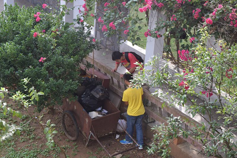 志愿者在学院内进行清扫工作