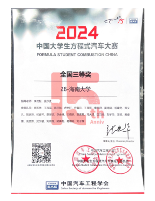 我院南海方程式赛车队携第五代赛车亮相中国大学生方程式汽车大赛(简称2024FSCC),经过五天的激烈角逐,获得2024年中国大学生方程式汽车大赛全国三等奖。