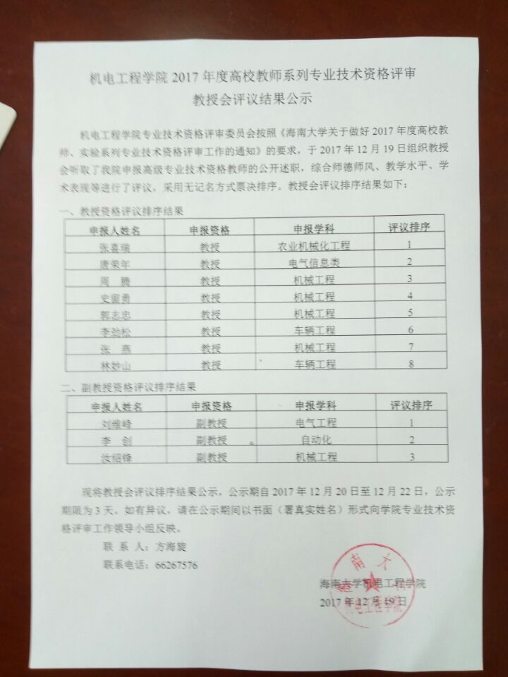 英国上市公司365专业技术资格评审委员会按照《海南大学关于做好2017年度高校教师、实验系列专业技术资格评审工作的通知》的要求,于2017年12月19日组织教授会听取了我院申报高级专业技术资格教师的公开述职,综合师德师风、教学水平、学术表现等进行了评议,采用无记名方式票决排序。教授会评议排序结果如下: