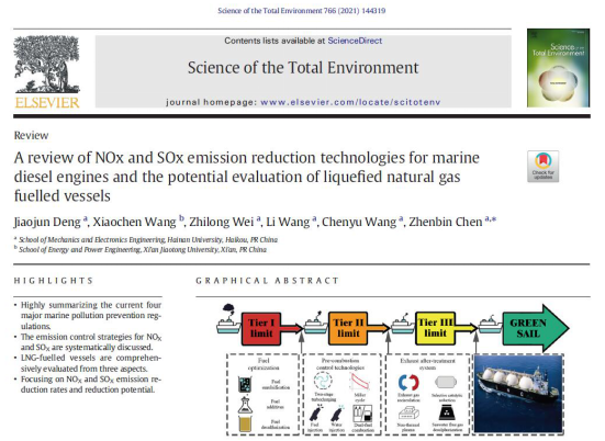 2021年4月20日,Elsevier旗下期刊《Science of the Total Environment》正式出版题为“A review of NOx and SOx emission reduction technologies for marine diesel engines and the potential evaluation of liquefied natural gas fuelled vessels”的综述论文(doi:10.1016/j.scitotenv.2020.144319),该论文以海南大学为第一单位,2019级机械工程专业硕士生邓交均为第一作者,导师陈振斌教授为通讯作者。《Science of the Total Environment》为SCI源刊,影响因子为6.551,中科院一区top期刊(2020年12月最新升级版)。